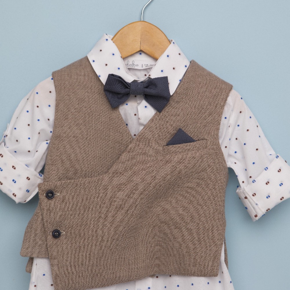 Φόρεμα σε alfa γραμμή από κεντημένη εκρού οργάντζα με μικρά λουλούδια σε χρώμα εκρού, ροζ και old pink. Στους ώμους σχηματίζονται 2 φιόγκοι από το ίδιο το ύφασμα.