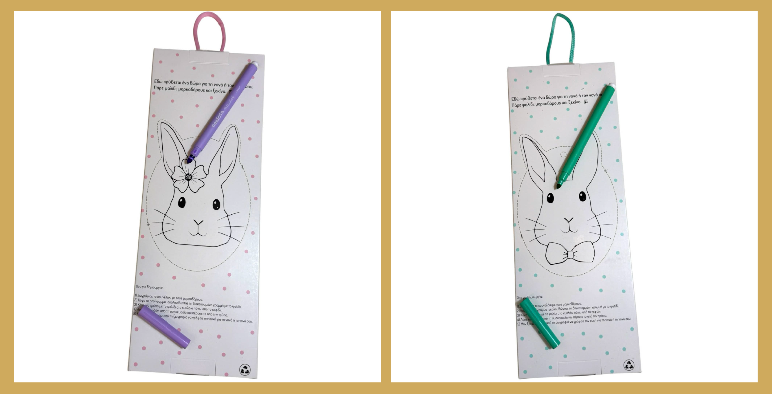 Στο πίσω μέρος κάθε συσκευασίας περιμένουν ένας λαγός και μια λαγουδίτσα, έτοιμοι να πάρουν ζωή. Είναι η στιγμή που το παιδί, μαζί με τον νονό και τη νονά, μπορούν να καθίσουν παρέα και να αφιερώσουν χρόνο στη δημιουργία. Δεν υπάρχουν κανόνες εδώ. Μπορεί να γίνει μια πολύχρωμη ζωγραφιά με μαρκαδόρους, ένα πρωτότυπο κολάζ με χαρτιά, υφάσματα, κορδέλες ή οτιδήποτε άλλο σκεφτούν εκείνη την ώρα.